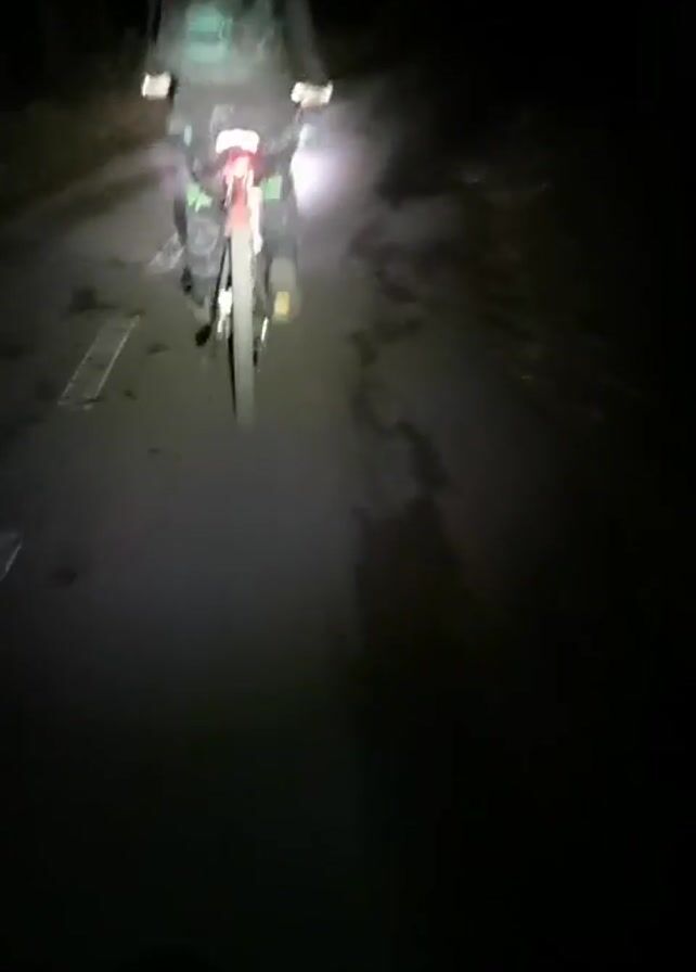 The video depicts a first-person perspective of someone riding a bicycle on a dark road at night