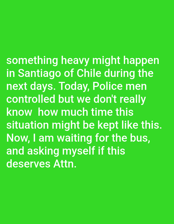 The image displays white sans-serif text against a solid bright green background. The text reads: "something heavy might happen in Santiago of Chile during the next days. Today, Police men controlled but we don't really know how much time this situation might be kept like this. Now, I am waiting for the bus, and asking myself if this deserves Attn." The content of the text specifically refers to anticipated events in the city of Santiago, Chile, mentioning police control and the narrator's current action of waiting for a bus.