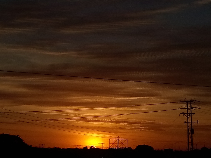 The image depicts a dusk or dawn scene in El Dátil, Venezuela, characterized by a prominent sunset and industrial infrastructure. The sky dominates the frame, showcasing a gradient from intense orange and yellow hues at the horizon to darker blues and grays towards the top, with horizontal, striated cloud patterns visible throughout. The sun is present as a bright, low-lying yellow disc near the center-right, partially obscured by the horizon line. Multiple dark, horizontal power lines traverse the upper and mid-sections of the image. On the far right, a large, multi-armed power transmission pylon is silhouetted against the bright sky. Towards the center-left, another significant, grid-like metallic structure is silhouetted on the horizon. The foreground consists of a dark, indistinct silhouette of land, trees, and other distant structures. No individuals, actions, or specific interactions are discernible within the static landscape.
