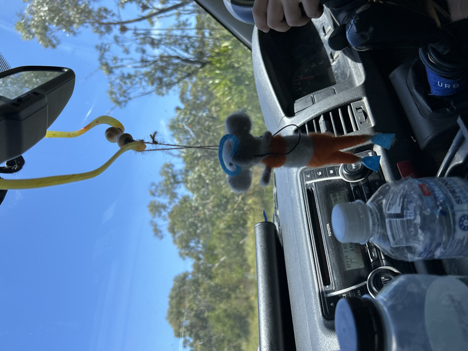 Inside a vehicle, a fuzzy mouse doll wearing swimming gear is suspended from the rearview mirror. The dashboard is visible, featuring a car radio and a water bottle. Outside the window, trees are visible under a bright blue sky. The doll is wearing orange shorts, blue flippers, and blue goggles. The dashboard is gray plastic. The scene suggests a road trip or a parked vehicle with a whimsical touch.
