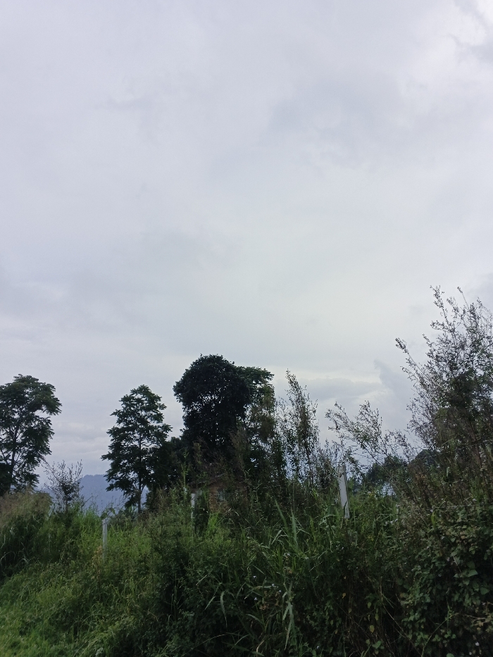 The image displays an overcast, natural landscape located in São Félix do Xingu, Brazil. The upper two-thirds of the frame are occupied by a light gray, cloudy sky. Below the horizon line, distant, muted blue-gray hills or mountains are faintly visible. The midground features several trees; from left to right, these include a broad-crowned tree, a conical tree, and a large, dense tree, all characterized by dark green foliage. Partially obscured behind dense foreground vegetation, a structure with a reddish-brown roof and light-colored walls is discernable in the central-right midground. The foreground is dominated by a thick growth of wild, green and brownish grasses and leafy plants. One vertical, light-colored post is visible within this dense vegetation, positioned slightly right of center. No individuals, animals, or explicit actions are observed within the scene.
