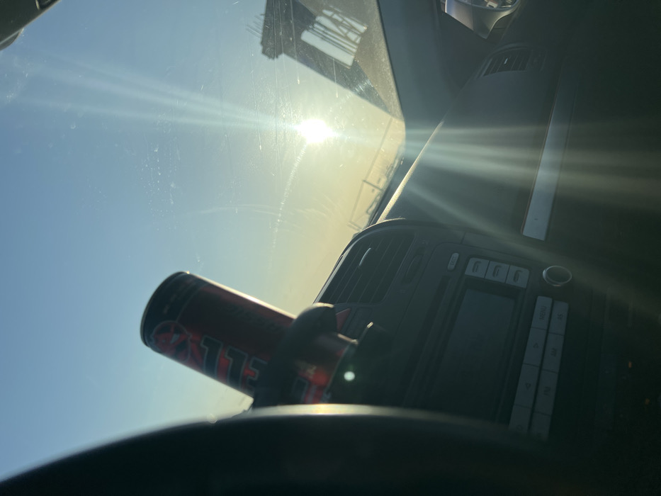 The image depicts the interior of a vehicle, viewed from a passenger-side perspective looking forward through the windshield on a bright, sunny day. The sun is low in the sky, casting significant lens flares across the windshield, which exhibits visible dust, streaks, and spots. Within the vehicle's cabin, the left portion of a dark-colored steering wheel is visible on the far left. The dashboard occupies the lower half of the frame, featuring a dark grey finish. A car radio/infotainment system is centrally located, with a dark screen, multiple buttons, and a rotary knob. An air vent is visible above the radio system. A red and black "HELL" branded energy drink can is secured upright in a holder positioned to the left of the central air vents. Through the windshield, a clear, light blue sky is visible, transitioning to a yellowish hue near the horizon. In the far distance, a horizontal line suggests an elevated road or structure. To the extreme right, a large concrete structure with diagonal support beams, indicative of a major overpass or bridge, is partially visible. The specific architecture of the concrete overpass on the right strongly suggests the location is in Sofia, Bulgaria, near the intersection of Tsarigradsko Shose and Dragan Tsankov Blvd, specifically depicting the overpass leading towards Arena Armeec or connecting to the Sofia Ring Road.