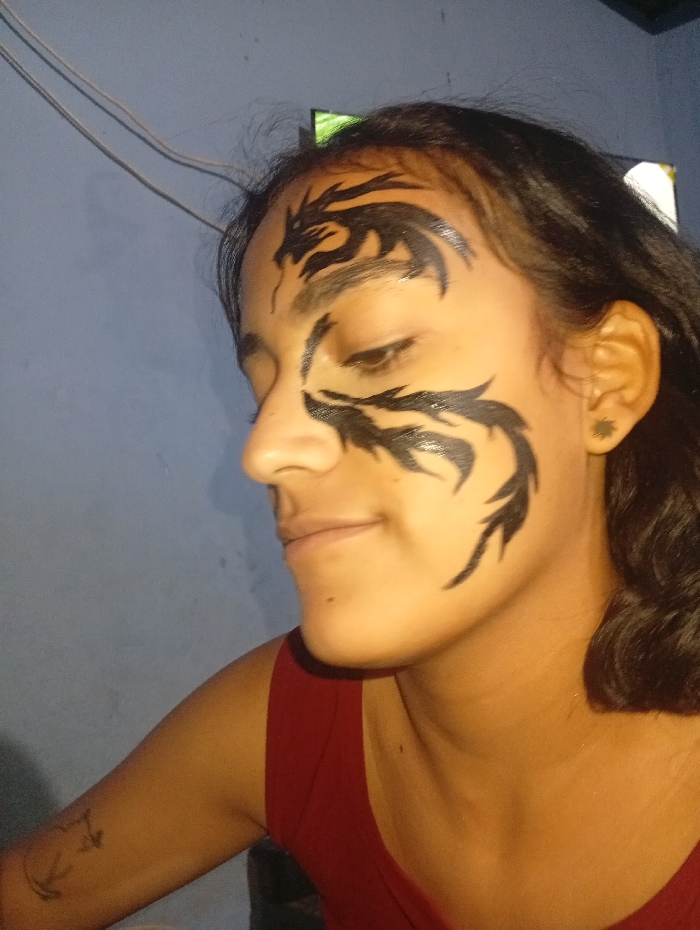 A young woman poses in profile, showcasing tribal-style face paint resembling dragons or stylized flames. The dark markings extend from her forehead and cheekbone, curving towards her eye and hairline. She wears a deep red tank top. A small tattoo is visible on her upper arm. Wires are visible against a blue wall in the background. Her hair is dark and slightly curled. She has a small black stud earring.