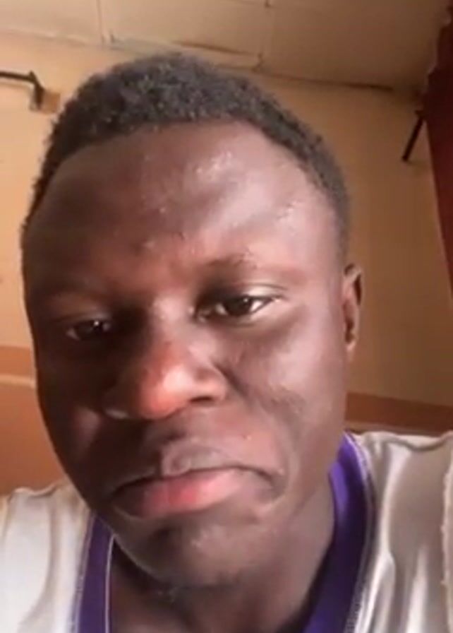 A close-up, eye-level shot features a dark-skinned man with short, dark hair. He is wearing a white t-shirt with purple trim around the neckline. The background is a simple, beige wall with a white ceiling panel visible at the top of the frame. The man is looking directly at the camera with a slightly furrowed brow, and his mouth appears to be pursed. The lighting is moderate and casts some shadows on his face. There is a curtain visible slightly to the right of the frame.