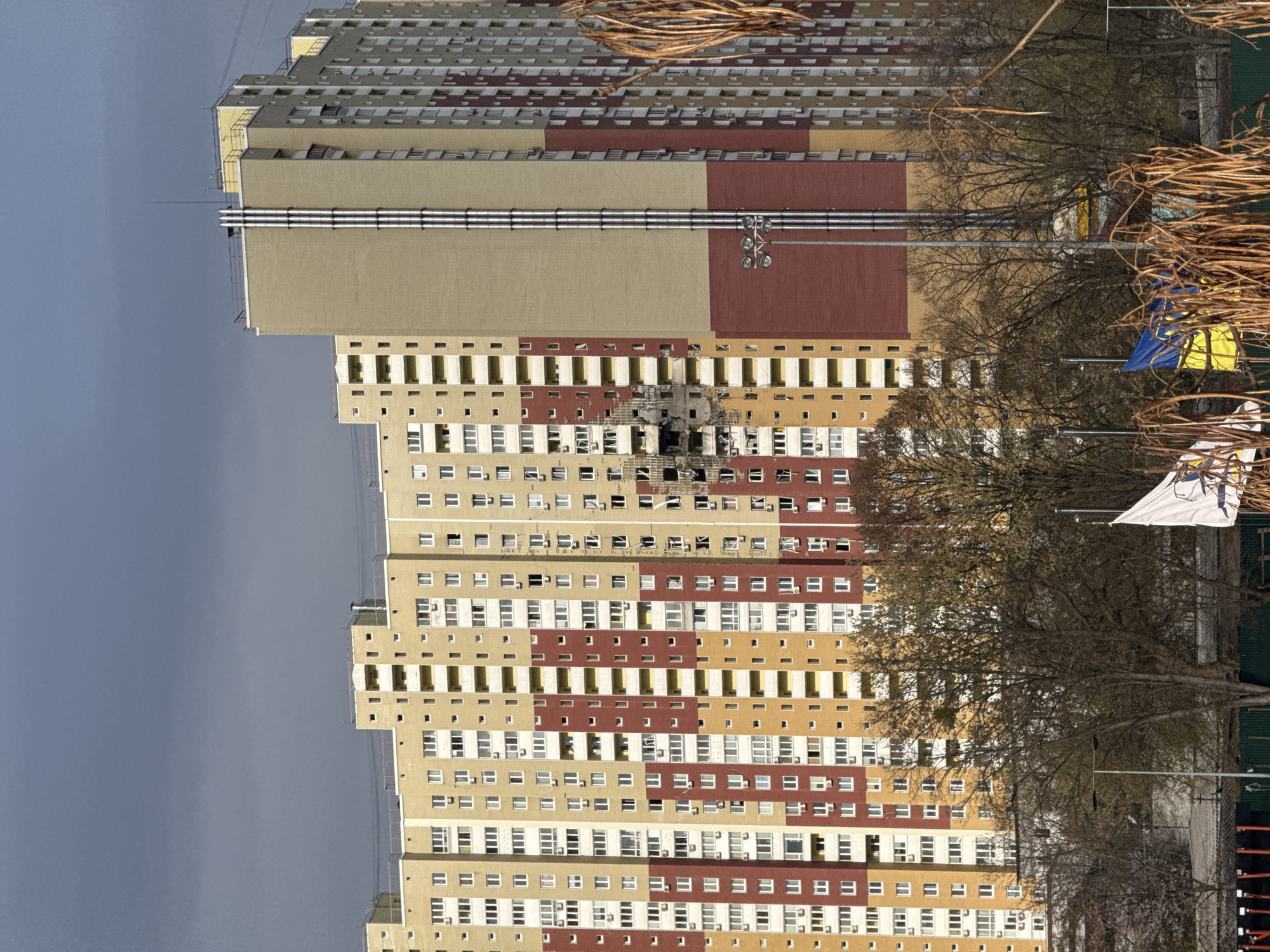 The image depicts a tall, multi-story residential building in Kyiv, Ukraine
