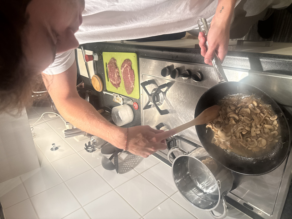 A young individual, appearing male, is depicted in a domestic kitchen preparing a meal. The person is seen from the chest up, with brown, curly hair, wearing a white t-shirt and grey sweatpants. Their left arm, adorned with a red string bracelet on the wrist, holds a wooden spoon, actively stirring sautéed mushrooms and sliced onions in a black frying pan situated on a stainless steel gas stovetop. Steam rises from the pan. The individual's right hand grasps the handle of the frying pan, and an infinity symbol tattoo is visible on the back of this hand. To the left of the frying pan, a stainless steel pot filled with water rests on another burner. To the right of the stovetop, on a dark countertop, a green cutting board displays two raw, seasoned steaks. A clear container of granular white substance and a dark pepper mill are positioned nearby. The kitchen features white rectangular tiled backsplash walls and overhead artificial lighting. The specific location within the city of Eindhoven, Netherlands, cannot be determined from the visual evidence presented.
