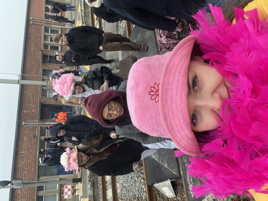 The image captures a crowded outdoor scene at a train station platform in Dunkirk, France, under an overcast sky. In the immediate foreground, a young woman with dark hair smiles directly at the viewer, wearing a bright pink terrycloth bucket hat adorned with a red stylized flower emblem, and a large, vibrant pink feather boa obscuring part of her lower face. She has a nose piercing. Behind her, approximately a dozen individuals are visible on the concrete platform alongside active railway tracks. To the left, a woman in a black jacket and light pants wears an elaborate hat featuring a pig's head surrounded by white floral elements and small colorful spheres. Adjacent to her, a man in a dark hooded jacket carries a backpack. Further right, a woman in a light jacket smiles while wearing a large, fluffy pink hat resembling a cloud. Another woman, positioned between the foreground subject and the aforementioned individuals, wears a maroon hooded sweatshirt and glasses, looking downward. To the right of the "cloud hat" woman, a man in a black jacket and brown trousers stands with his hands in his pockets. On the far right, a person is partially visible, pulling a red piece of luggage with white polka dots. In the background, a two-story brick station building with numerous windows and doors runs parallel to the platform. Additional people, some in regular attire and others in festive hats, populate the platform and areas near the building. Some individuals in the far background wear bright orange safety vests. A white post with red and white checkered markings is visible on the platform to the far left. The railway tracks, including sleepers and ballast, are clearly delineated between the platform edge and the crowd.