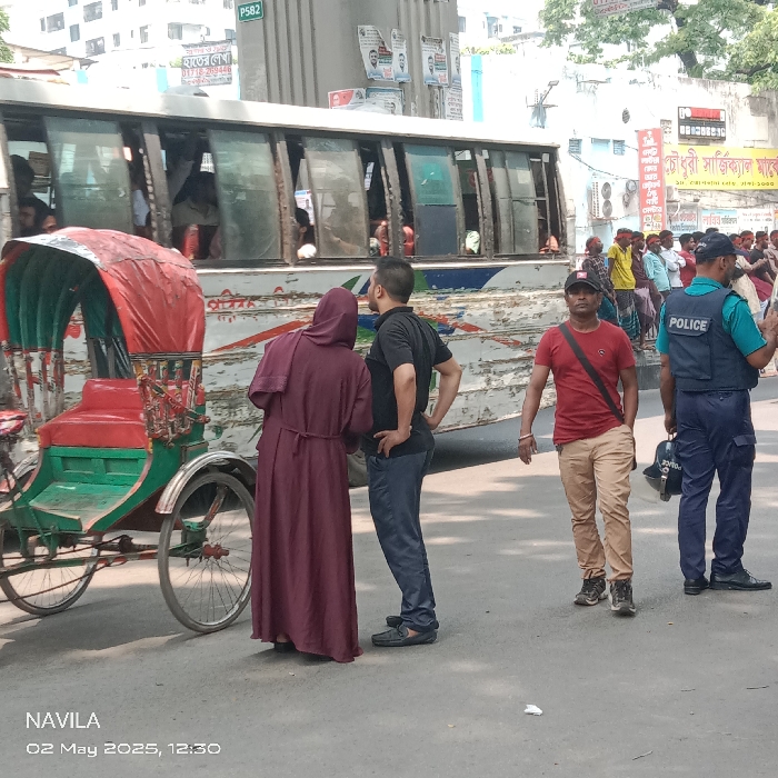 A street scene shows a three-wheeled rickshaw parked near a bus with people inside. Nearby, a person in a maroon robe stands next to a man in a black shirt. Another man in a red shirt and khaki pants stands nearby. A police officer in uniform holds a helmet. A crowd of people gathers in the background. A building is visible behind the crowd.