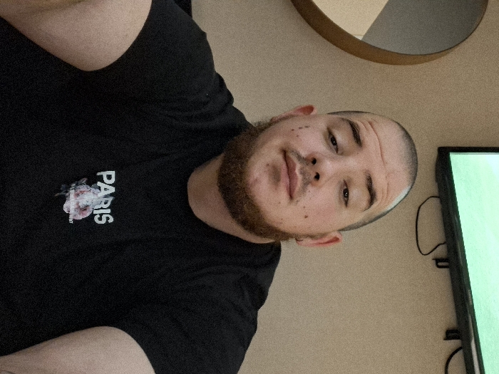 A close-up, chest-up portrait shows a male subject indoors