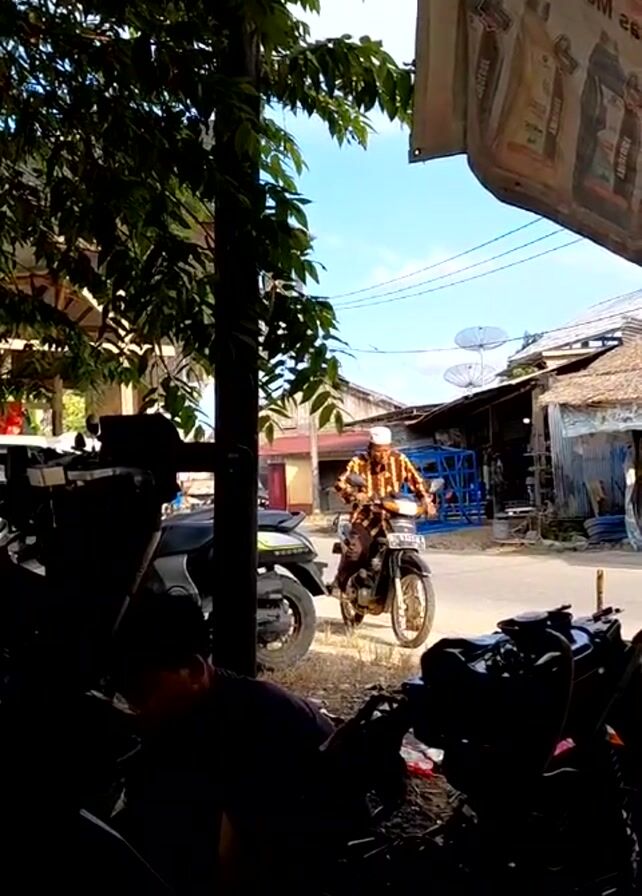 man on a motorcycle in what appears to be a residential or commercial area. The man is wearing a patterned shirt, pants, and a white head covering. He is riding an older model motorcycle. The motorcycle has a license plate that reads "BL 6320 KA." The background includes buildings, trees, and satellite dishes. In the foreground, there is a person working on another motorcycle. The scene is captured under a partly cloudy sky.