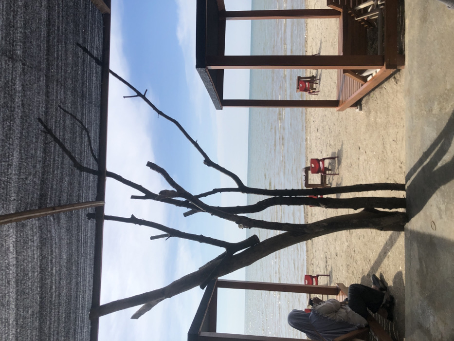 A beach scene shows a calm ocean under a blue sky with scattered clouds. A structure with a shaded roof and open sides frames the view, revealing red chairs on the sand. A bare tree branch stretches across the frame, casting a shadow on the sand. A person sits in a chair under a shaded structure. The image is rotated, presenting a slightly tilted perspective.