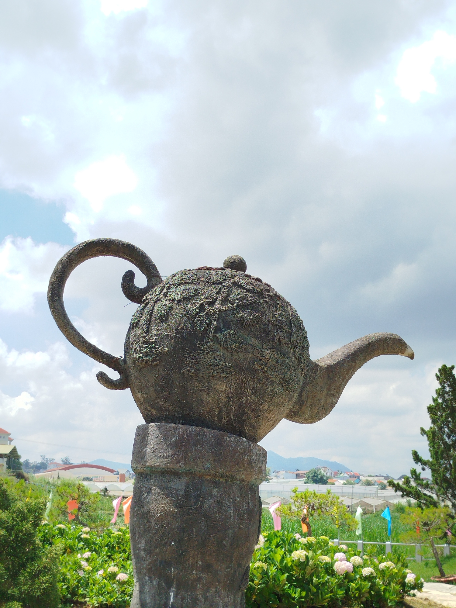 A bronze statue of a teapot stands in a garden setting in Lâm Viên - Đà Lạt, Vietnam