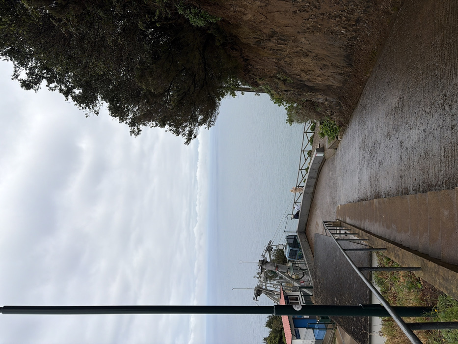 The image depicts an overcast day at a coastal overlook in Santana, Portugal, featuring a cable car station. A wet, downward-sloping paved path occupies the lower center and right, originating from a section with concrete steps and a metal handrail on the left. A tall, dark vertical pole stands prominently in the far left foreground. To the left of the path, in the midground, is the upper station of a cable car system. It comprises blue and white structures, visible mechanical components, and a green cable car gondola parked near the platform. Adjacent to the cable car station, a wooden post-and-rail fence delineates a viewing area overlooking the sea. Three individuals are present near this fence: one person, dressed in a light-colored coat, stands facing the ocean, while two others are partially visible closer to the cable car station. The background features a vast, calm, blue-grey ocean extending to the horizon under a light grey, overcast sky. On the right side of the image, a steep, dark brown earthen cliff face is visible, heavily vegetated with dense green trees and shrubs. Sparse green vegetation grows alongside the foreground path and steps.