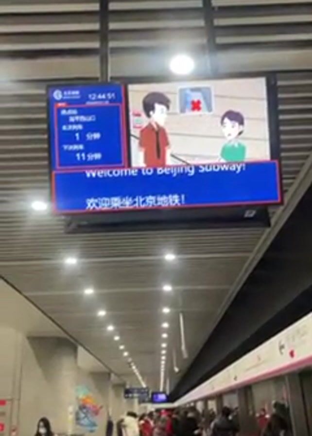 subway platform in Beijing, China. People are standing on the platform, waiting for a train. The subway train doors are closed. Overhead is an electronic display screen showing information about the next train and a public service announcement in the form of a cartoon. The cartoon depicts two people, and gives guidance on wearing masks, using escalators, and helping the elderly. The platform is brightly lit, and the ceiling is made of parallel metal beams. There is art on the wall of the platform.