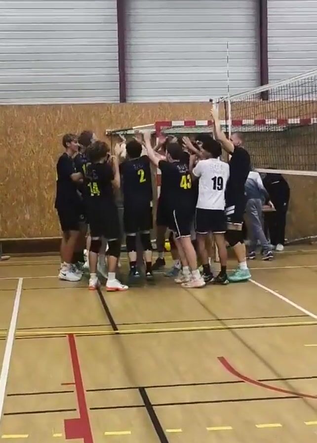 - "A group of about ten teenage male volleyball players wearing dark jerseys and shorts gather in a tight huddle on a volleyball court, reaching their arms up into the center of the circle" by FM-NIq6z1, licensed under CC BY 4.0