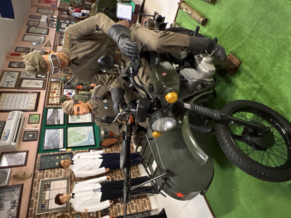 Two uniformed mannequins sit atop a vintage motorcycle with a sidecar. The motorcycle is olive green and features a red star on the sidecar and fuel tank. It has a large black tire and a front headlight. The mannequins wear vintage military uniforms and goggles. The scene is set indoors with walls covered in framed memorabilia.