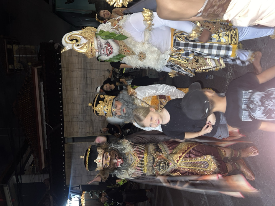 This image depicts a nighttime street scene in Munggu, Indonesia, likely during a cultural performance or parade. Three individuals in elaborate, traditional costumes are prominently featured, flanked by two children in the foreground. The leftmost costumed figure wears a dark brown and maroon ensemble with gold accents. Their face is covered by a mask resembling a rat or mouse, featuring a long snout, visible teeth, and large, pointed ears. A gold and black crown adorns their head, and their costume includes fur-like elements around the neck and chest. This individual stands barefoot. The central costumed figure is dressed in white and gold, with a golden crown and a painted face featuring a gray beard, conveying an elderly or dignified character. They stand barefoot. The rightmost costumed figure is in a predominantly white and gold costume, featuring a large white mask with prominent fangs and red mouth accents, framed by green leaves and white fur. A tall, elaborate white and gold headdress crowns their head. This figure wears a black and white checkered sarong over white trousers and stands barefoot. In the mid-ground, a blonde-haired girl in a black t-shirt and gray shorts stands between the central and leftmost costumed figures, smiling slightly to her left. In the immediate foreground, with his back to the viewer, a young boy in a black t-shirt with a white graphic print that reads "KARMA SATAN RUPA" and a black baseball cap observes the scene. The background shows traditional Indonesian architecture, including tiled roofs and structures with bamboo blinds, under dim artificial lighting. Several individuals are visible in the background, some observing, others near parked motorbikes, suggesting a public gathering or event. The overall lighting indicates an evening or nighttime setting, with strong frontal illumination on the main subjects.