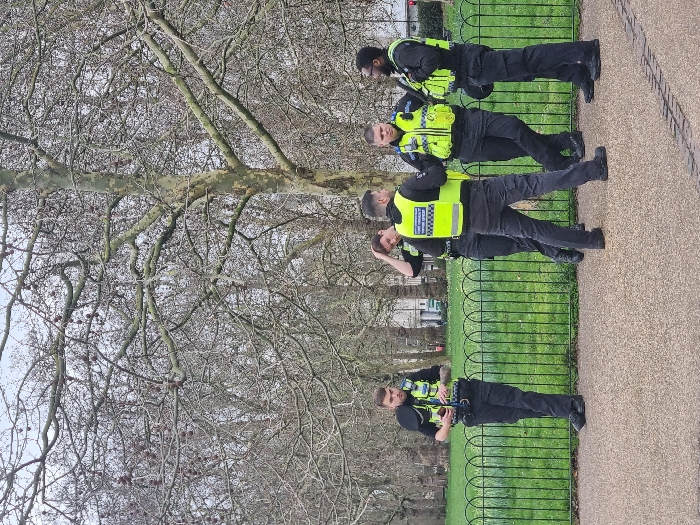 Five male Police Community Support Officers (PCSOs) are observed in an outdoor park setting in London, United Kingdom, during late winter or early spring