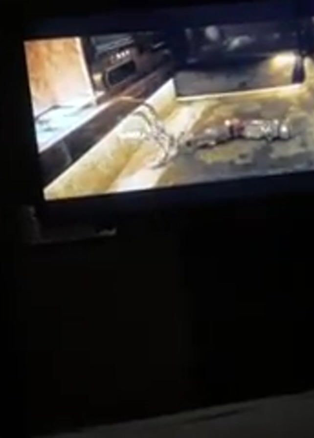 A television screen displays a close-up shot of a cluttered, stainless-steel surface, with what appears to be a remote control positioned in the foreground