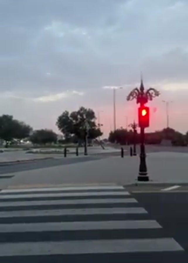 pedestrian crossing in a city. There is a decorative lamppost with streetlights in the background. The sky is overcast and a pink hue, suggesting sunset or sunrise. A car passes by on the road.