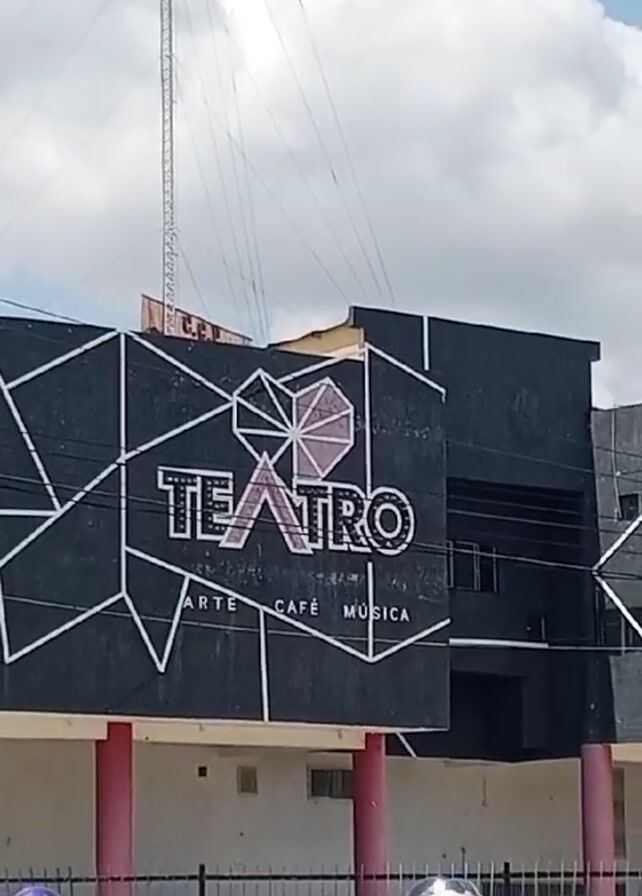 street scene in front of a building. The building has a black facade with white geometric designs and the word "TEATRO" in large, white letters. Below this, the words "ARTE CAFÉ MÚSICA" are written. The building also has pink columns supporting an overhanging structure. A tall, slender telecommunications tower is visible behind the building. In front of the building, there is street traffic consisting of a white taxi, several cars, and two motorcyclists. The sky is partly cloudy, with patches of blue visible. The motorcyclist in front is wearing a purple helmet, while the one behind is wearing a black helmet and a red shirt. The video captures a relatively busy street scene with the prominent building of a theatre in the background.
