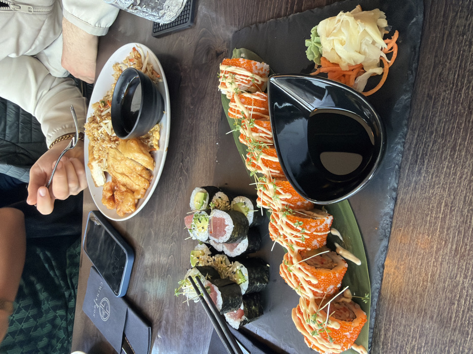 This image depicts an indoor restaurant scene at China Wok, located at Fischergasse 17, 89073 Ulm, Germany. Two individuals are partially visible at a dark wooden table. On the top right, a person in a light-colored jacket holds a fork above a white oval plate containing fried rice, several pieces of golden-brown fried tofu or chicken, and a small black bowl of dark dipping sauce. Adjacent to the plate, a dark coaster supports a textured clear glass. On the top left, a person wearing a dark green patterned shirt is partially visible. Next to them on the table is a closed black menu booklet displaying the white "CHINA WOK" logo and text, beside which rests a dark-colored smartphone in a light blue case, face down. The foreground features a black rectangular slate serving board laden with sushi. On the left side of the board are two stacks of six maki rolls each; one stack features tuna and green sprouts, while the other displays avocado and sesame seeds. Black chopsticks rest across the top of the leftmost tuna roll stack. To the right of the maki rolls, a row of eight uramaki (inside-out) sushi rolls, brightly coated in orange roe and drizzled with a light sauce, topped with green sprouts, extends across the board. A black, leaf-shaped bowl of dark liquid, along with a small pile of pickled ginger, shredded carrots, and a dollop of green wasabi, completes the arrangement on the slate.
