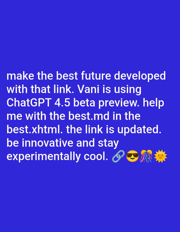 The image is a blue background with white text that reads: "make the best future developed with that link. Vani is using ChatGPT 4.5 beta preview. help me with the best.md in the best.xhtml. the link is updated. be innovative and stay experimentally cool." It is followed by three emojis: a chain link, a smiley face wearing sunglasses and party hats, and a sun. The coordinates provided, 16.046 latitude and 108.247 longitude, place the image in the city of Bắc Mỹ An, Vietnam. However, it is not possible to determine the precise location or any other details about the environment, people, or subjects in the image.