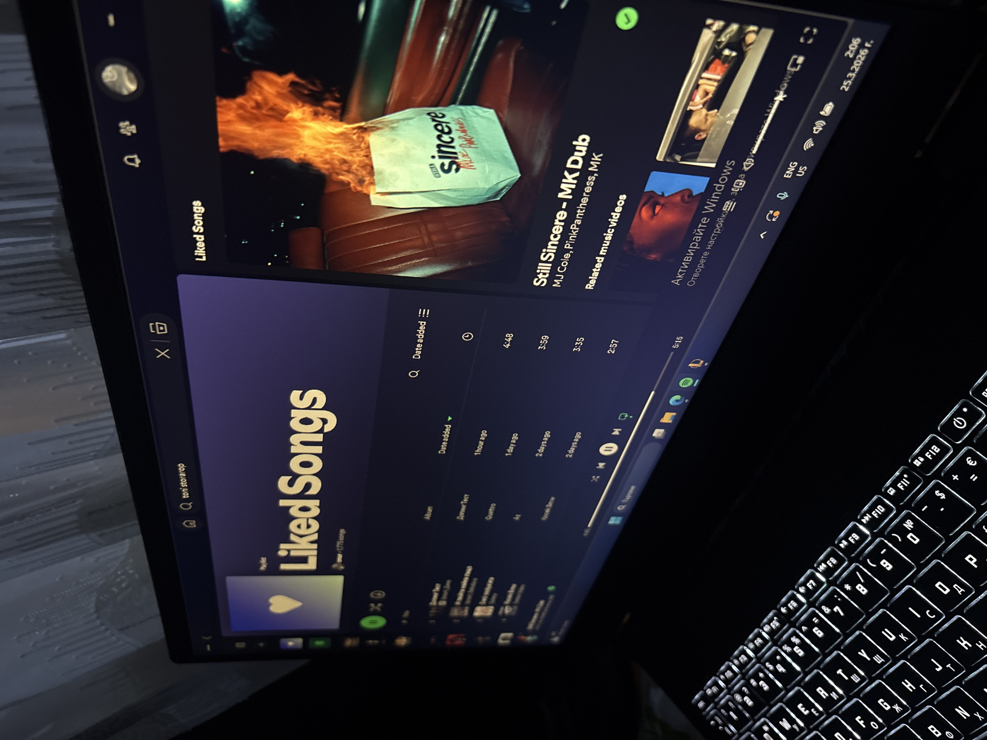 The image depicts a close-up, angled view of a laptop operating in a dimly lit indoor environment within the city of Byala Reka, Bulgaria. The laptop screen displays the Spotify music streaming application, specifically the "Liked Songs" playlist, with "toni storarop" visible in the search bar. The playlist contains "1,775 songs," and recently added tracks like "Дълъг Тест" and "Quattro" are listed. The main view on the right features the album art for "Still Sincere - MK Dub" by MJ Cole, PinkPantheress, MK, showing a light green paper bag engulfed in flames on a brown leather car seat. Below this, "Related music videos" display two thumbnails, one with a person's face under red light and another with a person in a vehicle. The Windows taskbar is visible at the bottom of the screen, indicating "2:06" AM/PM, the date "25.3.2026 r.", "ENG US" language settings, and an "Активирайте Windows" (Activate Windows) notification. The laptop's keyboard, featuring a backlit Cyrillic/Latin layout, is partially visible in the foreground. A light-colored, textured surface, possibly curtains or blinds, is reflected in the upper left corner of the screen. No individuals are physically present within the immediate scene.