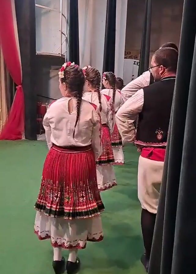 A line of people dressed in traditional Bulgarian folk costumes stand on a green stage. The line is mostly women with long braids and flower crowns. They are wearing white blouses with embroidery, and red skirts with intricate designs. A man with a beard and glasses stands on the end of the line, also in traditional clothing. He has his hand on his hip and is looking off to the side. The stage has red and black curtains, and there are metal supports in the background. The camera angle is slightly from behind and to the side of the group. The atmosphere appears to be one of anticipation, as if they are waiting to perform.