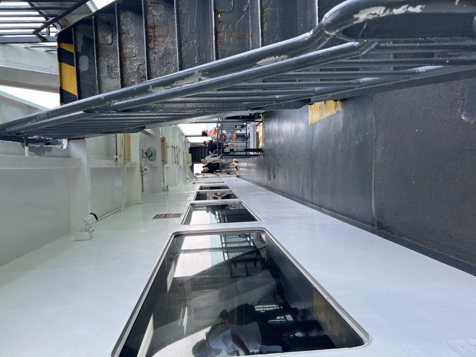 This image depicts the interior passenger deck of a ferry, likely in transit from Don Sak, Thailand. The scene is illuminated by natural daylight. To the left, a long, white wall with multiple rectangular windows extends into the distance. The windows reflect the interior of the ferry and the sea beyond. Through the leftmost window, the partial reflection of a person wearing a light-colored top is visible. Further down the walkway, a security camera is mounted on the white wall near the ceiling. To the right, a set of dark grey metal stairs with a matching railing ascends upwards and out of frame. The stairs show signs of wear, including chipped paint and visible rust, with black and yellow hazard tape applied to the uppermost visible step. The railing itself is also worn. The floor of the deck is dark grey, appearing to be an industrial-grade surface, with a faint yellow marking line visible near the base of the stairs. In the midground, a group of approximately 5-7 individuals, all adults, are standing near an open railing on the right side of the vessel, observing the external environment. They are casually dressed; one individual on the far right wears a colorful, possibly tie-dye, shirt. Their positions suggest casual observation or conversation. The ceiling is white, featuring visible piping and light fixtures. The ambient light indicates clear outdoor conditions, with the sea clearly visible through the windows and in the background beyond the group of people.