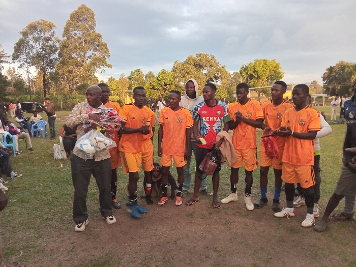 The image captures an outdoor scene on a grassy field in Chevaywa ward, Kenya, under an overcast sky with numerous trees in the background