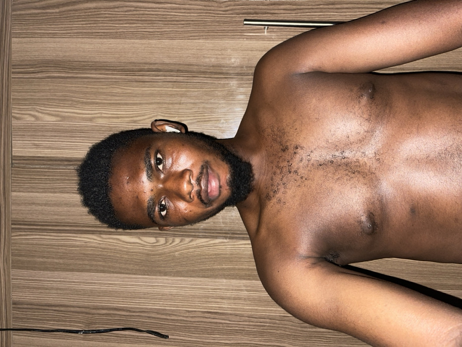 A dark-skinned man with a short afro and beard lies on a wooden-patterned surface. He is shirtless, revealing his chest and shoulders. The surface may be a floor or wall. A thin, black cord is visible near his head, and a metallic bar appears in the background. His gaze is directed towards the viewer, and his expression is neutral. The lighting is moderately bright, accentuating the details of his skin and hair.