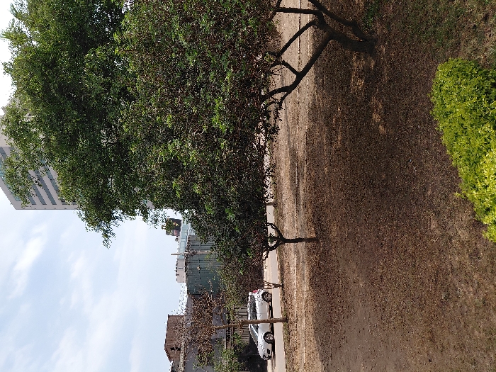 A street scene includes cars parked along a sidewalk under trees. A mix of buildings and trees form a backdrop to the scene. A tall skyscraper is visible on the left side, and shrubbery lines the right side. The sidewalk appears to be covered in mulch or dried leaves, casting shadows from the trees.