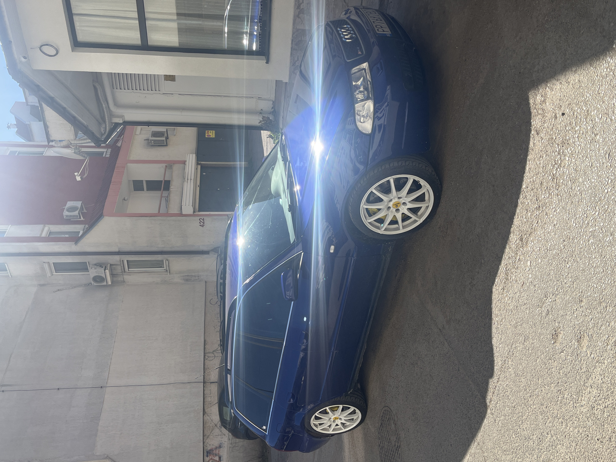 blue Audi A4 B6 Avant parked on an asphalt street in a residential area
