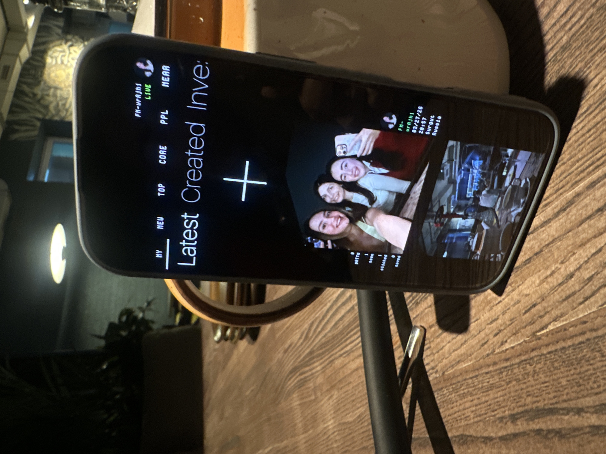 A dark-cased smartphone rests vertically on a wooden table. Its screen displays a dark interface with white text and images. Text elements include navigation options "MY," "NEU," "TOP," "CORE," "PPL," "NEAR," and the phrase "Latest Created Inve:" followed by a large plus symbol. A live status indicator "FN-urAjhl LIVE" with a small profile icon is present in the upper right. The screen prominently features an image of three young adult females, smiling, with the female on the right holding a smartphone, suggesting a selfie. Below this, a smaller, darker image depicts an indoor establishment with tables and lighting. Overlaid text on the screen specifies "03/27/26 20:57 Surgut Russia," identifying the location and time. Metrics labeled "DATA," "seen," "clicked," and "saved" are partially visible. On the wooden table next to the phone, a black cylindrical object, possibly a hookah hose, and a white ceramic mug with an orange interior rim are situated. The background is blurred, showing elements of an indoor setting, including a potted plant, a circular ceiling light fixture, and patterned wallpaper.