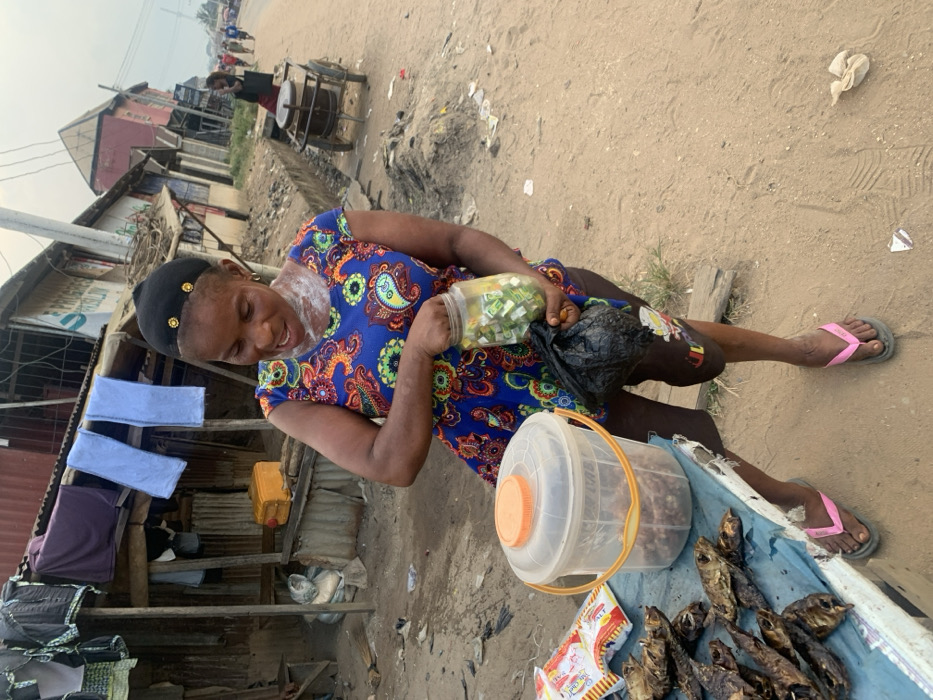 A woman wearing a blue paisley shirt and a black head covering is on the street, smiling and holding a jar full of small packets. She's standing near a bucket and a tray covered in dried fish. Laundry hangs on a makeshift clothesline. In the background, there's a street scene with buildings and people, including someone pushing a cart. The ground is sandy and appears to be outdoors.