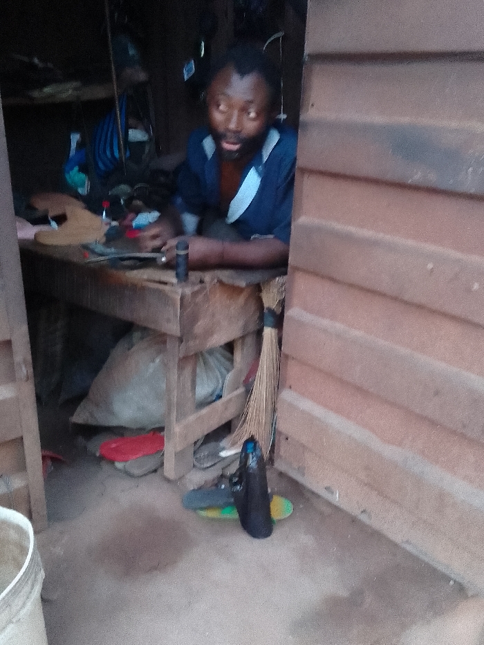 A partial view of an indoor space, identified as a workshop or stall, is depicted in the city of Unknown, Unknown. An adult male with dark skin, short dark hair, and a beard is centrally positioned, visible from the chest up, leaning forward over a light brown wooden workbench. He is wearing a dark blue shirt with a light blue diagonal stripe across the chest. His eyes are wide, and his mouth is slightly open, directing his gaze towards the viewer. On the workbench are various items, including a light-colored piece of material, possibly leather, and a dark cylindrical object. Behind the man, shelves hold bags, including a blue and black striped bag. Under the workbench, a large light-colored sack and a red plastic object are on the floor. To the right of the workbench, a traditional broom with natural fibers is propped against a wall constructed of horizontal wooden planks. On the dirt floor in the foreground, a black shoe with a blue interior rests on a green and yellow object, alongside a gray shoe. A white plastic bucket is partially visible in the lower left foreground.