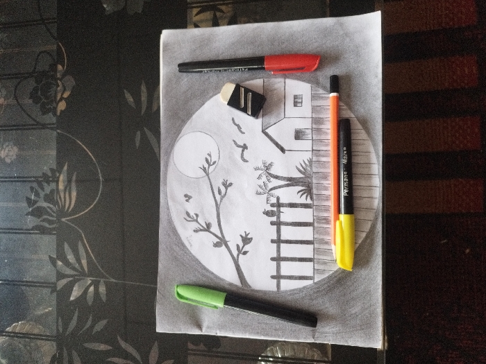 An overhead photograph taken in Nyeri, Kenya, depicts various art supplies arranged on a pencil drawing, which rests upon a dark, patterned surface. The primary subject is a monochrome pencil sketch on a white sheet of paper, centered within a circular border. The sketch illustrates a landscape featuring a simple house with a window and pitched roof, two palm trees, and a wooden fence on the right side, balanced by a bare deciduous tree, a full moon, and three birds in flight on the left. Subtle pencil shading is visible both inside and outside the circular drawing on the paper. Specific objects include a black marker with a red cap, oriented horizontally above the drawing; a black and white rectangular eraser positioned centrally over the sketch; an orange wooden pencil and a black marker with a yellow cap, both oriented vertically along the right edge of the sketch; and a black marker with a green cap, oriented horizontally below the drawing. The underlying surface is dark, likely a tabletop, exhibiting reflective properties and adorned with lighter-toned floral and leaf motifs. No individuals are present.