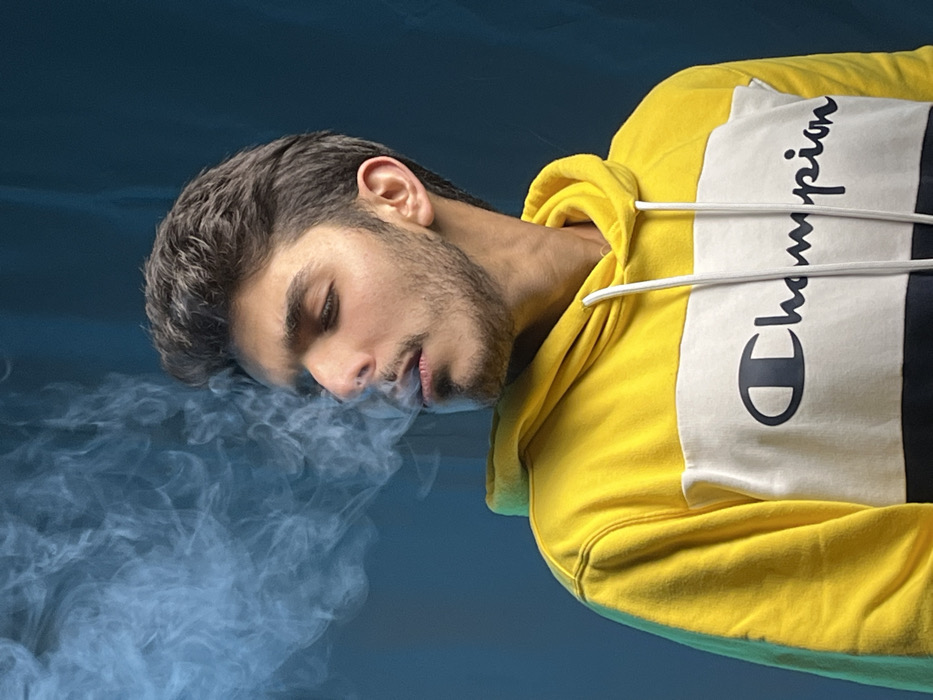 A young man with dark hair and a beard is shown in profile. He is wearing a yellow and white Champion hoodie. His eyes are closed, and smoke or vapor is emerging from his mouth. The background is a deep teal color, and the lighting gives the scene a slightly surreal quality. The image suggests the act of exhaling smoke, possibly from a vape or cigarette.