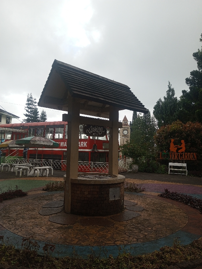 A wishing well with a brown shingled roof stands on a circular, patterned stone base. Behind it, a red double-decker bus labeled "Wishing Well Water Park" is partially visible. A clock tower rises between trees, while a "Lover Garden" sign with a bench is on the right. The overcast sky creates a muted color palette in the outdoor setting.