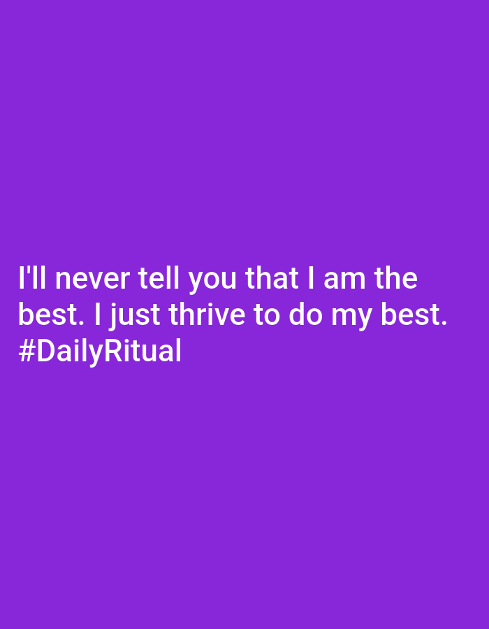 The image displays a static digital graphic with a solid, uniform purple background. White sans-serif text is horizontally centered in the lower portion of the frame. The text reads: "I'll never tell you that I am the best. I just thrive to do my best. #DailyRitual". This graphic is a textual and abstract composition; it intrinsically lacks depicted physical objects, individuals, or environmental elements that would render it geographically identifiable within the city of Tulsa, United States.