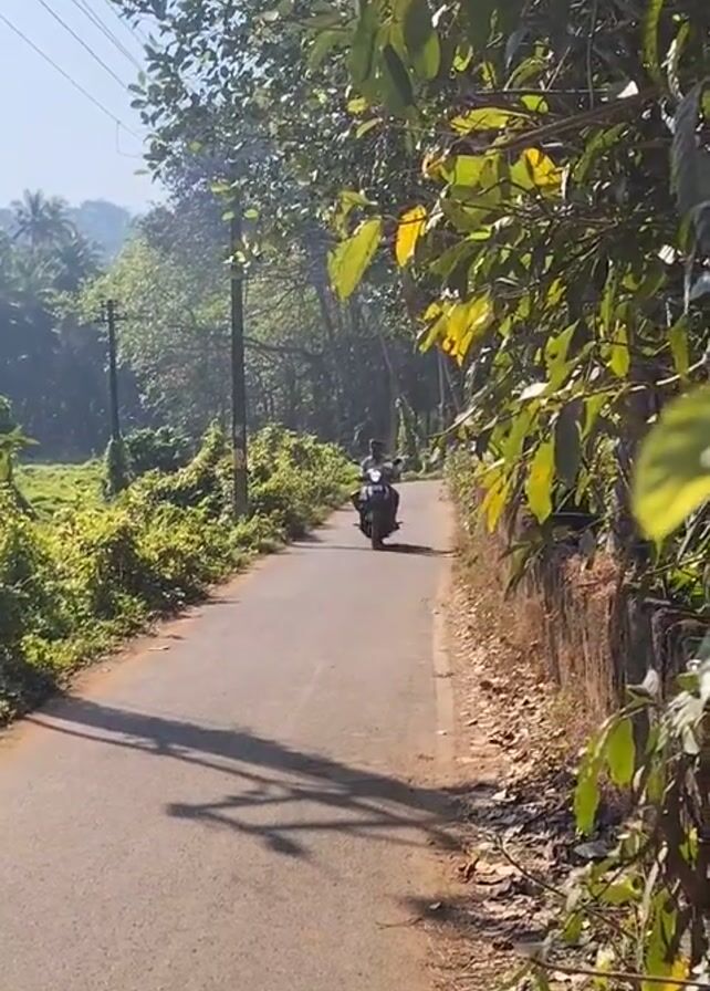man riding a scooter on a narrow paved road. The scooter is gray and the man is wearing a light-colored shirt. The road is surrounded by lush green vegetation. The sun is shining and casting shadows on the road. There are power lines visible above the trees. The scene appears to be in a rural area, possibly a small village or countryside.