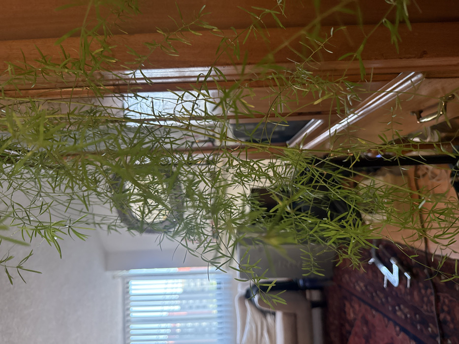 Green foliage drapes downwards in front of a blurred interior scene. A window with blinds is visible in the background, along with light-colored curtains. To the right, a reddish-brown patterned rug hangs. A glimpse of a round mirror can be seen through the foliage. A wooden cabinet is at the top of the scene.