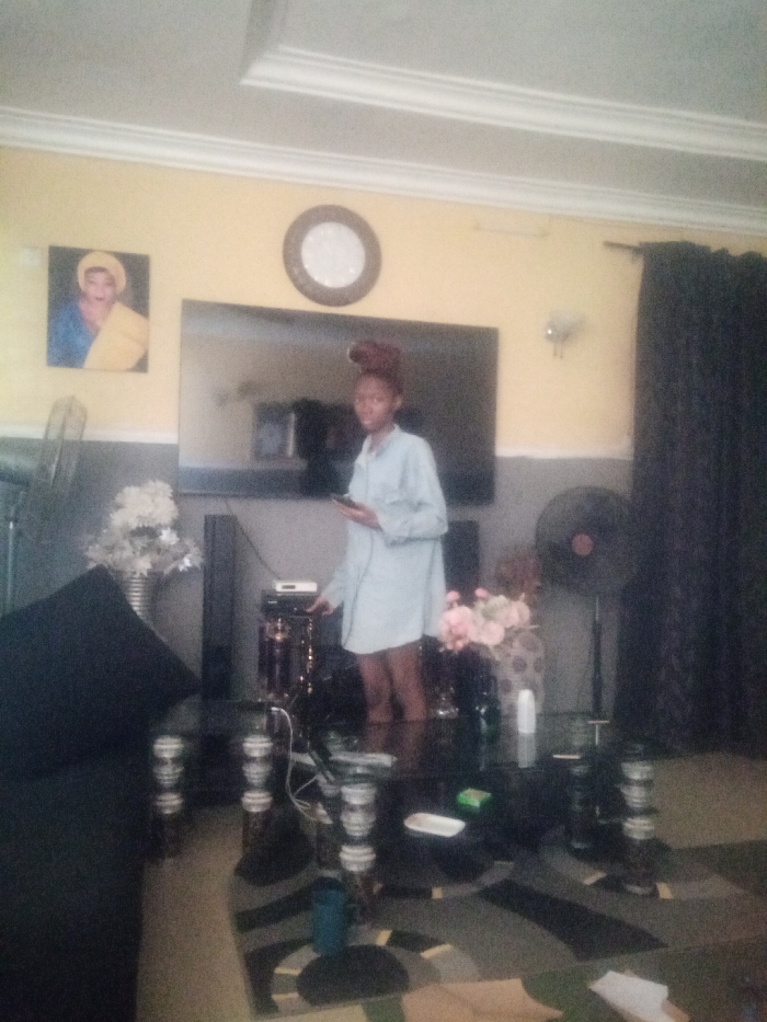 The image depicts an indoor living room scene in the city of Unknown, Unknown. A young female individual with hair styled in a high bun stands centrally, facing forward. She wears a light blue/grey long-sleeved shirt extending to mid-thigh, exposing her legs. Her left hand holds a dark smartphone, while her right hand is positioned near an electronic component, consistent with a stereo receiver or media player, situated on a decorative stand with dark, reflective vertical bars. To the left of the individual stands a tall black speaker. To her right, a vase contains artificial pink and white flowers. The background features a large black flat-screen television mounted on a light yellow wall. Above the television is a circular, dark-framed decorative wall hanging with a light center. To the left of the TV, a framed portrait depicts a person in blue attire with a yellow headwrap/shawl. A wall sconce is visible to the right of the TV, and dark curtains partially obscure a black standing fan with a red hub on the far right. In the foreground, a dark sofa with a black pillow is positioned on the left. A dark-colored coffee table with decorative silver and dark segmented legs is centered, displaying a white rectangular dish, a green object, and a white bottle. A blue cup rests on the patterned rug beneath the table. The floor is covered by a light brown carpet, overlaid with a geometric gray, black, and light brown rug. Wires are visible around the electronic equipment and on the coffee table. Papers are scattered on the carpet in the bottom right. The ceiling is white with crown molding.