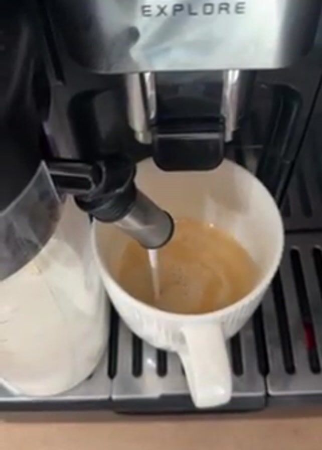 - "A DeLonghi Eletta Explore coffee machine is shown dispensing what appears to be steamed milk into a white mug of coffee" by FM-92uQy1, licensed under CC BY 4.0