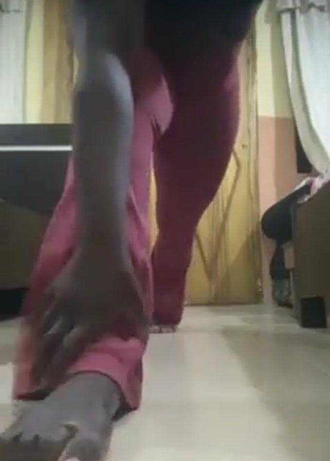A woman is doing a plank on the floor. She is wearing pink leggings and a black sports bra. The floor is a light color, and there is a door and a curtain visible in the background.