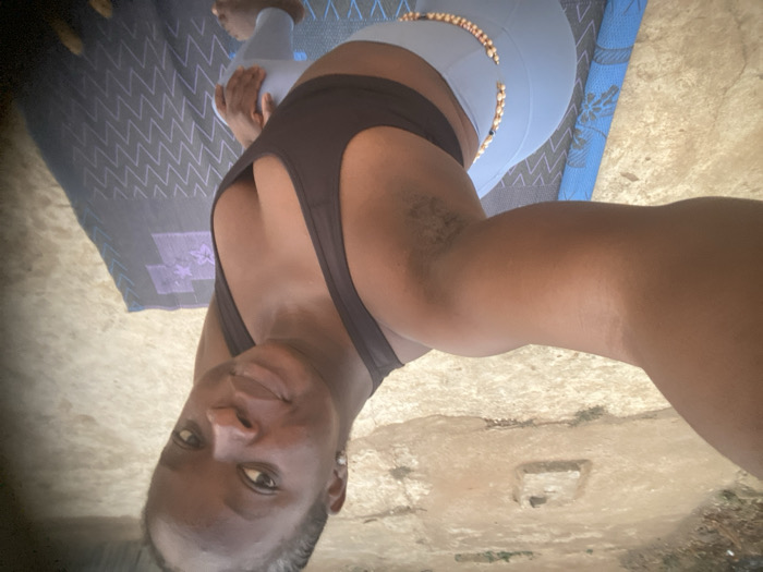 A woman wearing a black sports bra and light blue leggings is facing the camera in a selfie