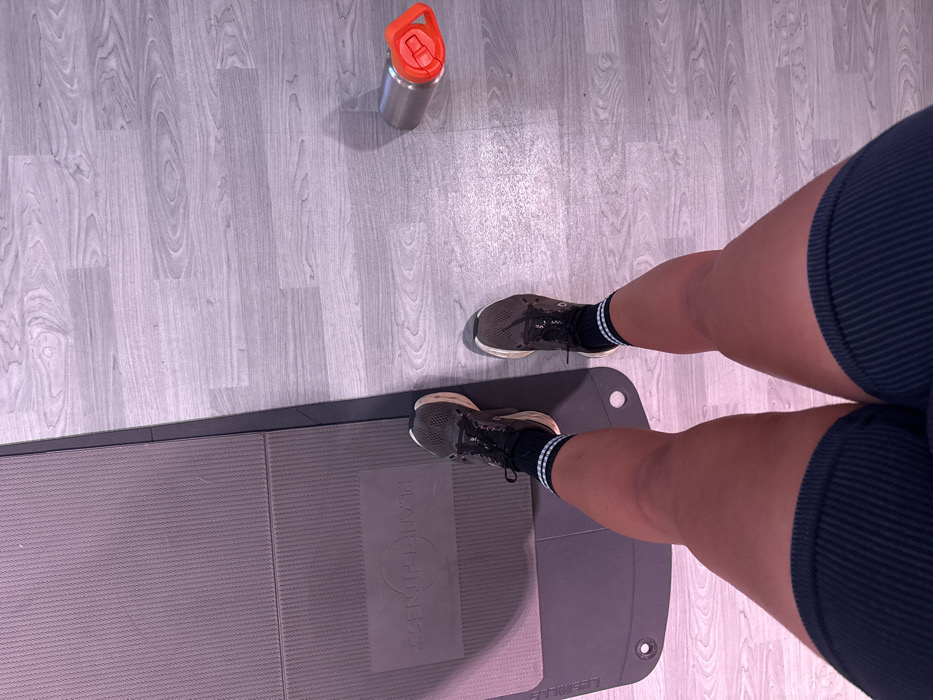 The image displays a top-down view of a person's lower body within an indoor environment, identified as a Planet Fitness gym located at Rue de l'Union, 59150 Wattrelos, France