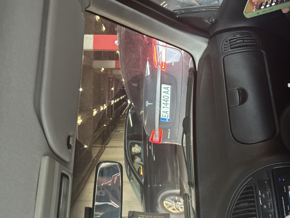 The image displays an indoor vehicular scene, likely within a parking garage or tunnel, with artificial lighting and concrete architecture. The perspective is from inside a vehicle, looking forward through the windshield. **Location:** City of Unknown, Unknown. The immediate environment is an enclosed structure characterized by a low ceiling, exposed overhead lighting fixtures, and concrete walls and pillars, some of which are painted red. **Subjects/Objects:** * **Forefront Vehicle (from camera's view):** A dark grey Tesla Model S is directly ahead, viewed from the rear. It displays a Ukrainian license plate "EA 1440 AA". Its taillights are illuminated. * **Vehicle to the Left:** A black four-door sedan (possibly a Mercedes-Benz, indicated by wheel design) is positioned to the left of the Tesla. * **People:** A male driver and a female passenger are visible in the front seats of the black sedan, both looking forward. Inside the camera vehicle, a reflection in the rearview mirror shows an individual holding a smartphone with visible camera lenses, indicating they are taking the photograph. A hand holding a separate, illuminated smartphone is visible on the far right of the frame, suggesting at least two occupants in the camera vehicle. * **Camera Vehicle Interior:** The dashboard, windshield wipers, and a section of the infotainment system (lower left) are visible. The rearview mirror is positioned centrally. * **Environment:** The overhead lighting creates reflections on the windshield and the vehicles. A red-painted concrete pillar is partially visible on the right side of the mid-ground. **Actions/Interactions:** The vehicles appear to be stationary or in very slow-moving traffic within the enclosed space. The photographer is actively capturing the scene with a smartphone.