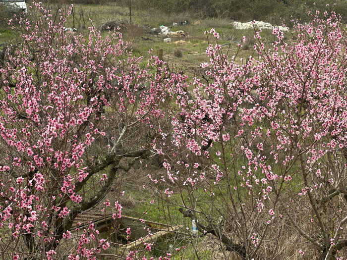 This image captures an outdoor scene in Petrich, Bulgaria, dominated by multiple deciduous trees in full bloom. The trees display an abundance of small, bright pink flowers distributed across their largely bare branches, indicating spring. The ground beneath and behind the trees is covered with green grass and some patches of dry, brown vegetation. In the upper left background, a pile of white, irregularly shaped debris is visible against the landscape. A smaller, darker pile of debris is present in the upper right background. In the lower mid-ground, partially obscured by the trees, a structure with a reddish-brown tiled roof is discernible. A white plastic bottle lies on the ground near the base of one of the central trees. No individuals, explicit actions, or interactions are depicted.